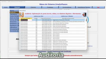 O Ecrã de Auditoria do LimaSoftware é uma das funcionalidades mais importantes do sistema, garantindo segurança, controlo e transparência na utilização do software.